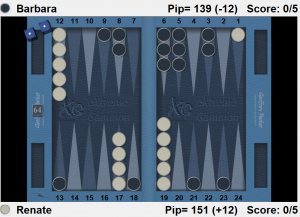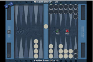 Michael mit den schwarzen Steinen hat großen Vorteil erzielt: Für Matthias Checker auf der Bar ist das geschlossene Board ein unüberwindbares Hindernis. Das letzte Problem für Michael sind die beiden schwarzen Steine die noch auf dem Ausgangspunkt stehen und durch...