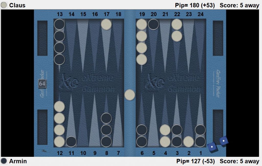 Im ersten Spiel des 5 Punkte Matches ist Claus gegen Armin bereits in der Eröffnung stark unter Druck geraten und Armin zückt den Dopplerwürfel… Claus liegt mit den weissen Steinen im Rennen deutlich hinten, ein weiterer Stein ist auf der Bar und auch an seiner Frontposition findet Claus aktuell keine Freude. Einzig der Anker auf […]